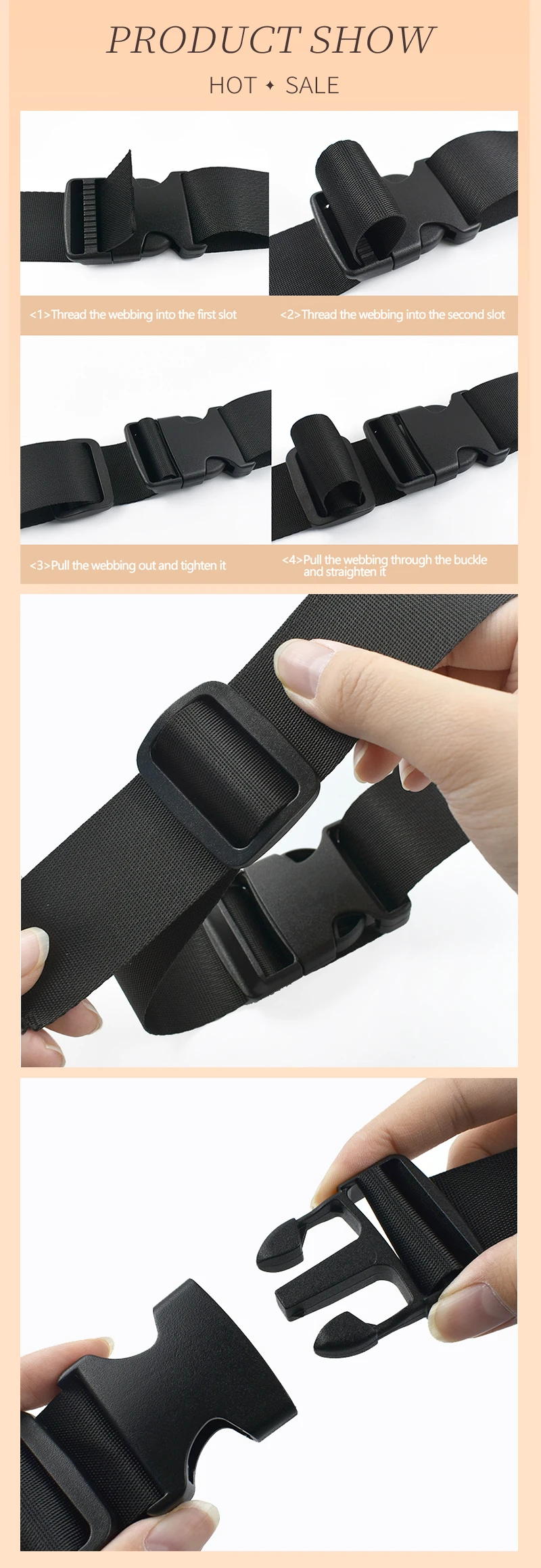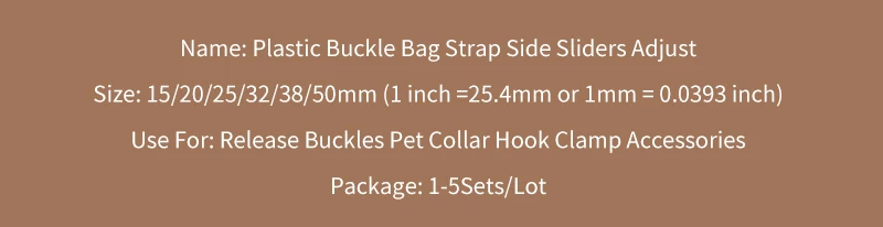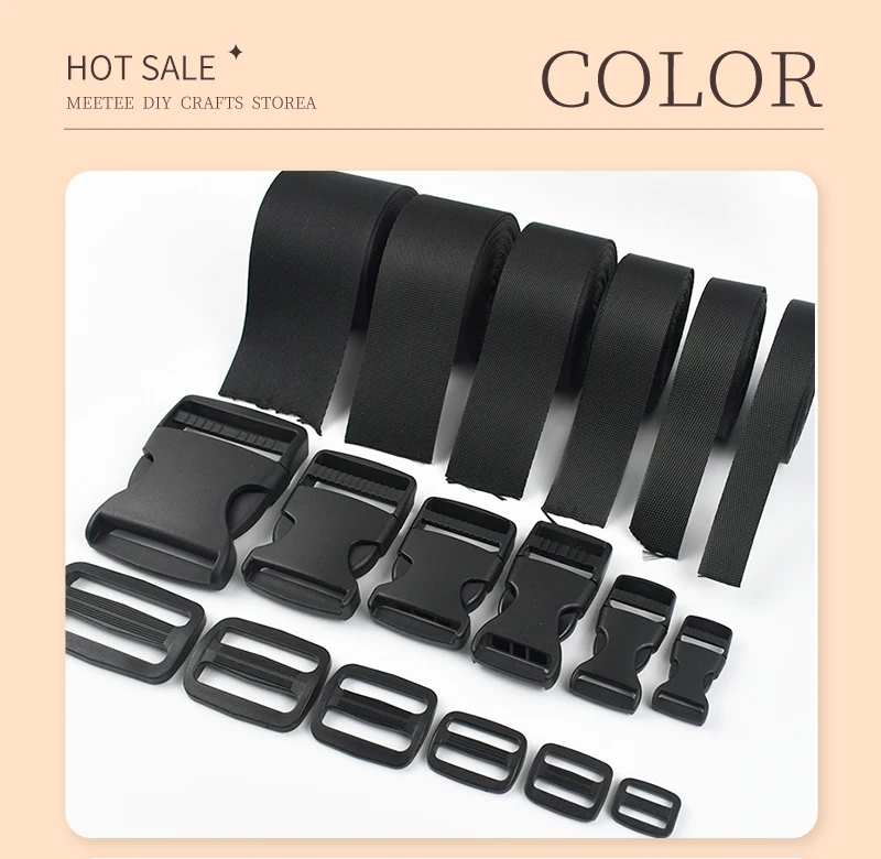 Feature: Brand: Meetee Name: Plastic Buckle Bag Strap Side Sliders Adjust Size: 15mm,20mm,25mm,32mm,38mm,50mm (1 inch =25.4mm or 1mm = 0.0393 inch) Use For: Release Buckles Pet Collar Hook Clamp Accessories Package: 1-5Sets/Lot (1Set=1Pc Release Buckle+1Pc Tri-Glide Buckle+1M Webbing) Notice: 1.Due to the light and screen difference, the item's color may be different from the pictures. 2.Please allow 1-3mm differences due to manual measurement.