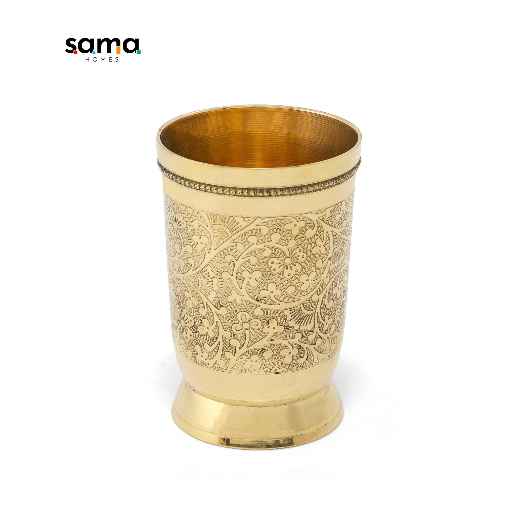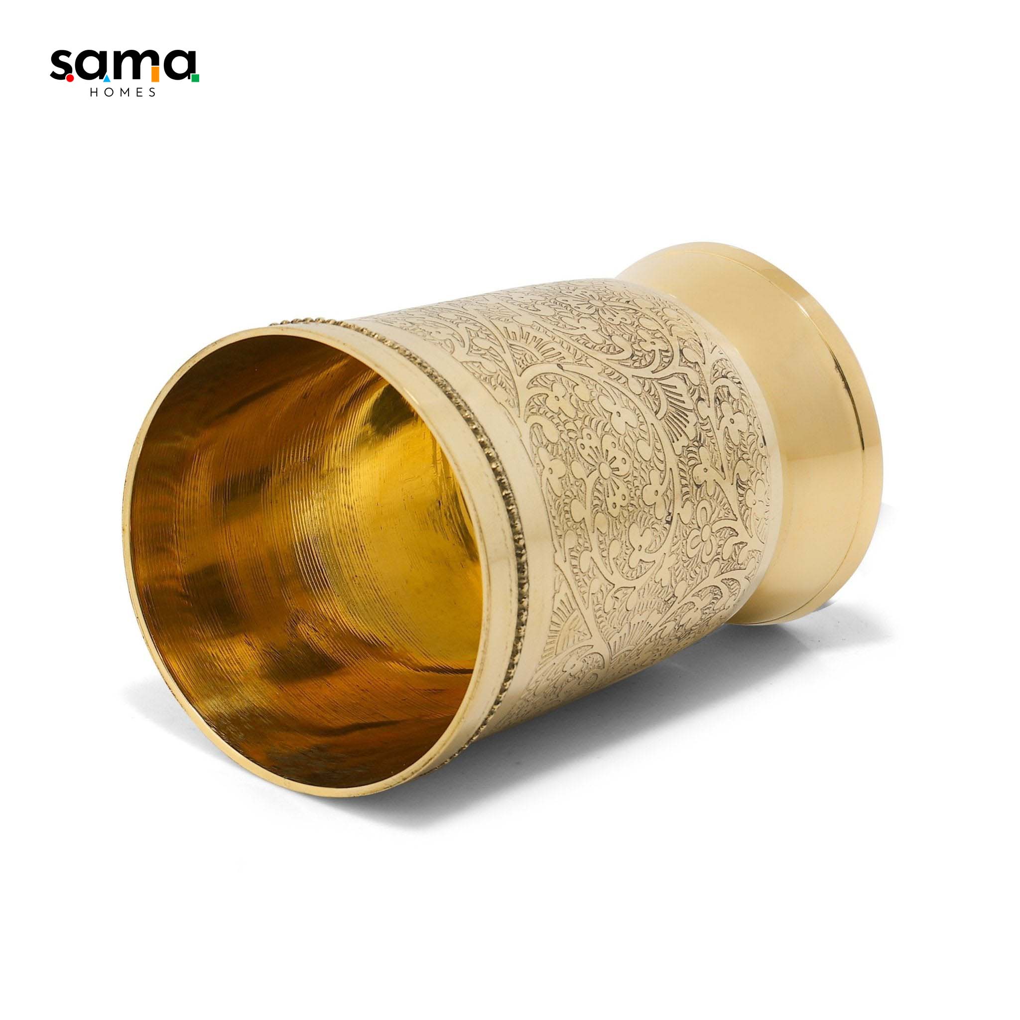 Introducing the Brass Drinking Glass by SAMA Homes - a stylish, eco-friendly choice for your everyday drinking needs. Made from 100% Indian hand crafted brass, this reusable glass is not only a style statement, but also reduces plastic waste. Elevate your drinking experience with this unique and environmentally conscious choice. Aesthetically crafted brass, hand made in India, this drinking glass by SAMA Homes is more than just a statement piece. It's a sustainable and environmentally conscious decision that reduces plastic waste and elevates your drinking experience to a whole new level of luxury.